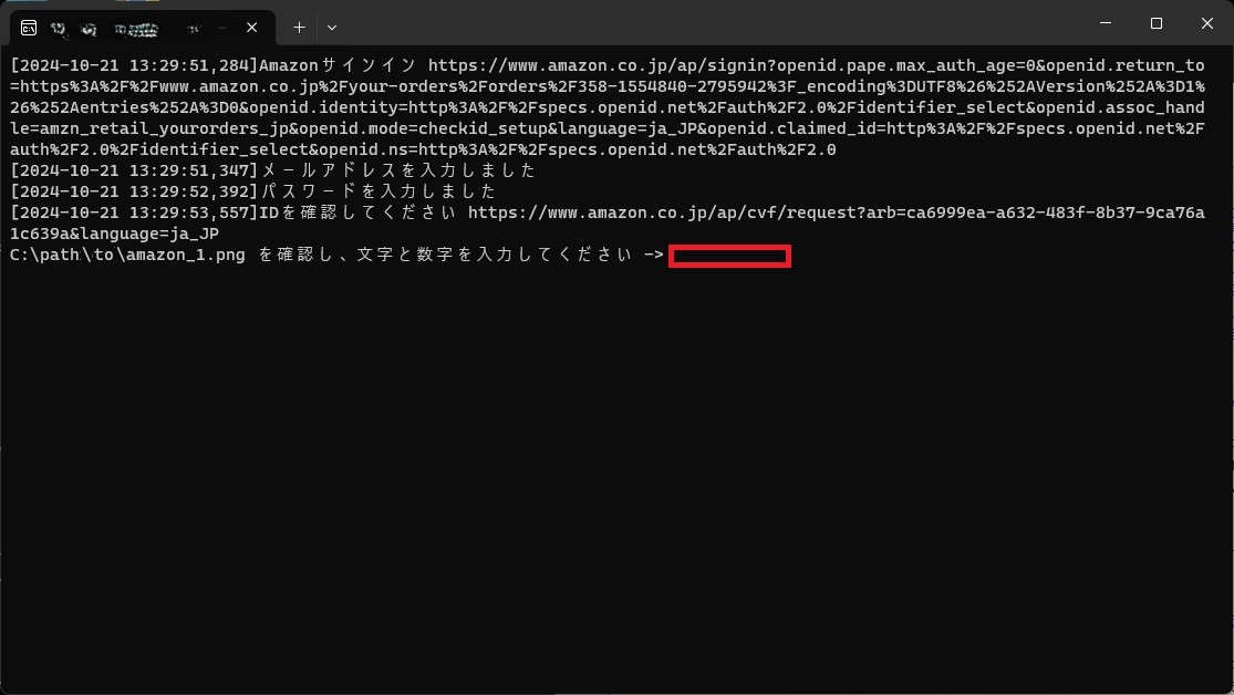 確認コードの入力が必要な場合は、コンソールに確認コードを入力し、「Enter」キーを押下してください。