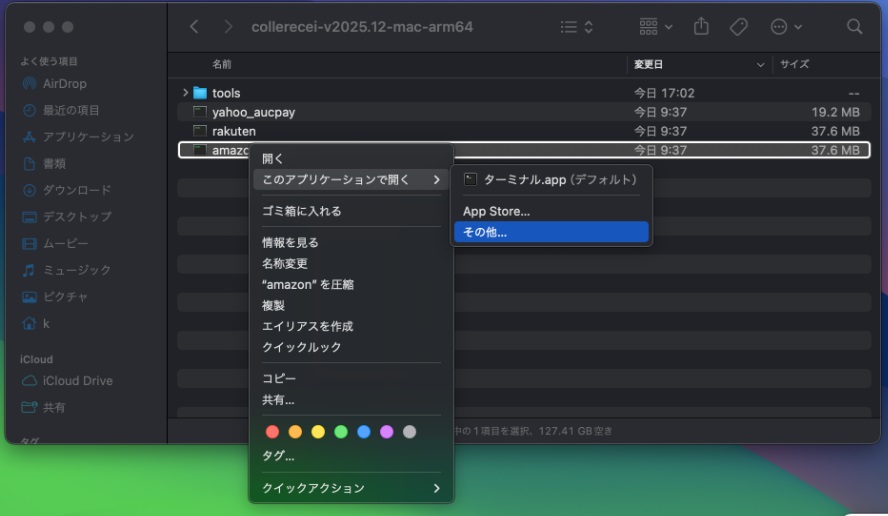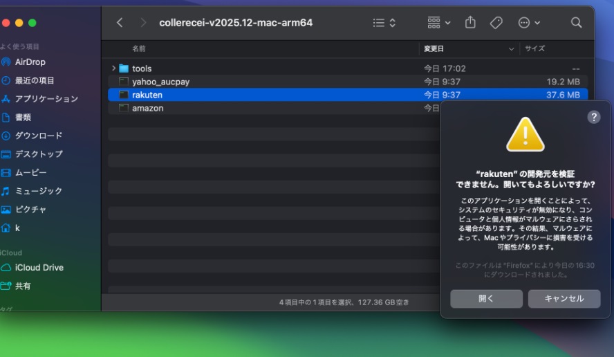 Finderでこれれしを解凍したディレクトリを開き、実行ファイルを副ボタンクリックする
