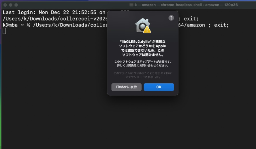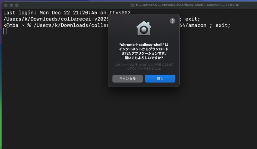 ターミナルが開き、chrome-headless-shellの確認ウィンドウが開いたら、「開く」をクリックする