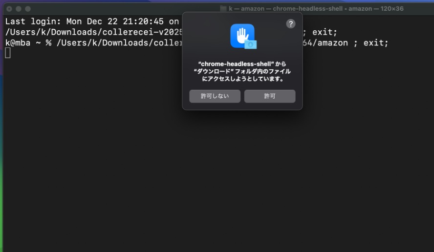 chrome-headless-shellからのアクセス許可ウィンドウが開いたら、「許可」をクリックする